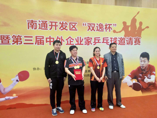 10月24日,三圣石墨代表隊(duì)參加南通開發(fā)區(qū)“雙逸杯”暨第三屆中外企業(yè)家乒乓球邀請賽,通過一天的緊張角逐,過關(guān)斬將,最終在24支代表隊(duì)中脫穎而出,獲得本次比賽冠軍。