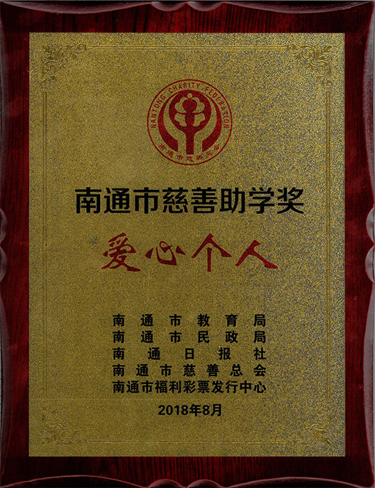 2018年8月15日,南通市教育局、南通市民政局、南通日?qǐng)?bào)社、南通市慈善總會(huì)、南通市福利彩票發(fā)行中心公布了“南通市慈善助學(xué)獎(jiǎng)”評(píng)選結(jié)果,南通三圣石墨設(shè)備科技股份有限公司董事長(zhǎng)馮圣君、鄭輝夫婦榮獲“南通市慈善助學(xué)獎(jiǎng)愛心個(gè)人”光榮稱號(hào),全市僅有11人獲此殊榮。