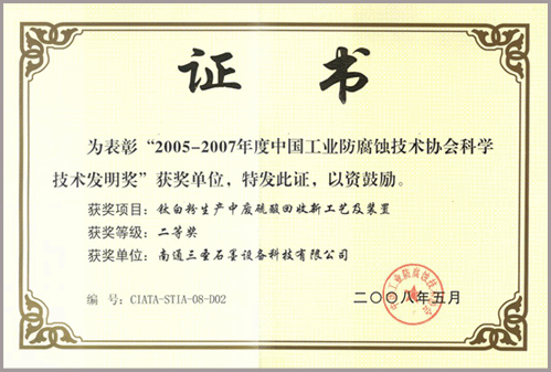 該技術(shù)通過了江蘇省科技廳科技成果鑒定,先后獲得:南通市人民政府科學技術(shù)進步二等獎、武漢市人民政府科學技術(shù)進步二等獎、中國工業(yè)防腐蝕技術(shù)協(xié)會科學技術(shù)發(fā)明二等獎并在多家鈦白企業(yè)中得到了應用。