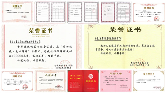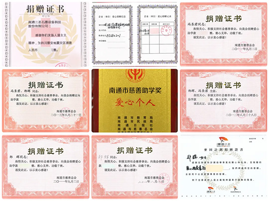 近二十年來(lái),南通三圣企業(yè)集團(tuán)通過(guò)設(shè)立專項(xiàng)基金、捐贈(zèng)物資、組織志愿者服務(wù)、參加公益活動(dòng)等多種形式,長(zhǎng)期致力于教育助學(xué)、鄉(xiāng)村振興、應(yīng)急救援、環(huán)境保護(hù)、助老助困等領(lǐng)域發(fā)揮自己的光和熱,也曾受到政府各級(jí)的諸多表彰。
