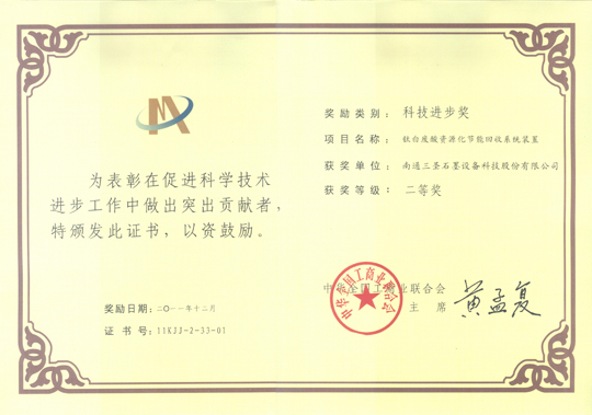 日前,從全國(guó)工商聯(lián)十屆五次執(zhí)委會(huì)議傳來佳音,南通三圣“鈦白鈦白廢酸資源化節(jié)能回收系統(tǒng)裝置”榮獲“2011年中華全國(guó)工商業(yè)聯(lián)合會(huì)科技進(jìn)步二等獎(jiǎng)”。